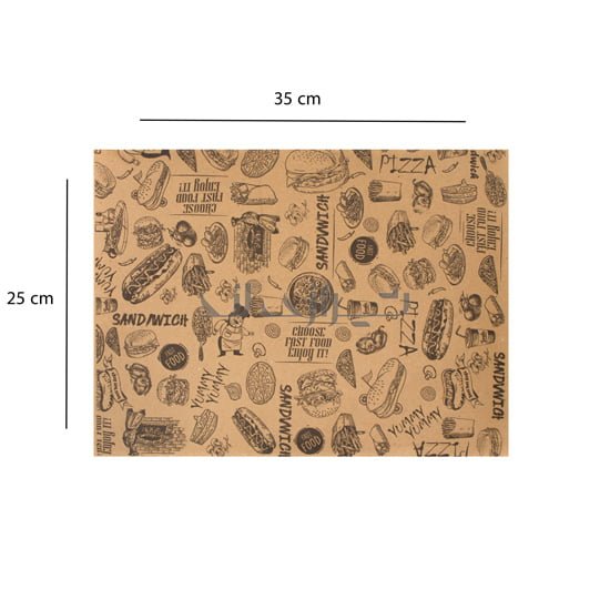 يعتبر ورق أرضيات الكرافت المطبوع مقاس 35 × 25 أمرًا مهمًا في الوجبات السريعة والمطاعم. يمكن استخدامه على صواني وسلال تقديم البطاطس وجميع أنواع الأطعمة المقلية، وكذلك تحت الأطباق في المطاعم.
